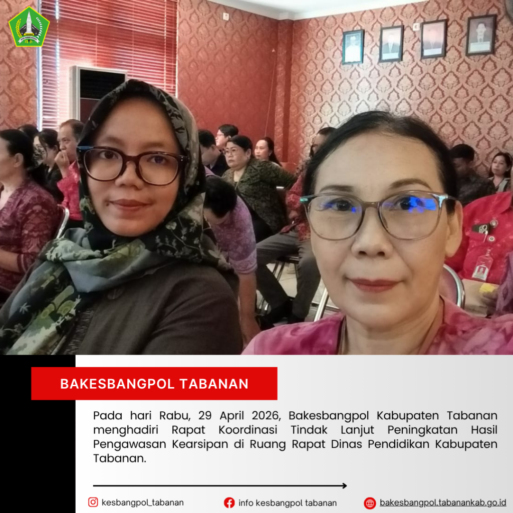 Pada hari Rabu, 29 April 2026, Badan Kesatuan Bangsa dan Politik Kabupaten Tabanan menghadiri Rapat Koordinasi Tindak Lanjut Peningkatan Hasil Pengawasan Kearsipan yang bertempat di Ruang Rapat Dinas Pendidikan Kabupaten Tabanan. Kegiatan ini diselenggarakan oleh Dinas Perpustakaan dan Arsip Provinsi Bali bersama Biro Umum Sekretariat Daerah Provinsi Bali.