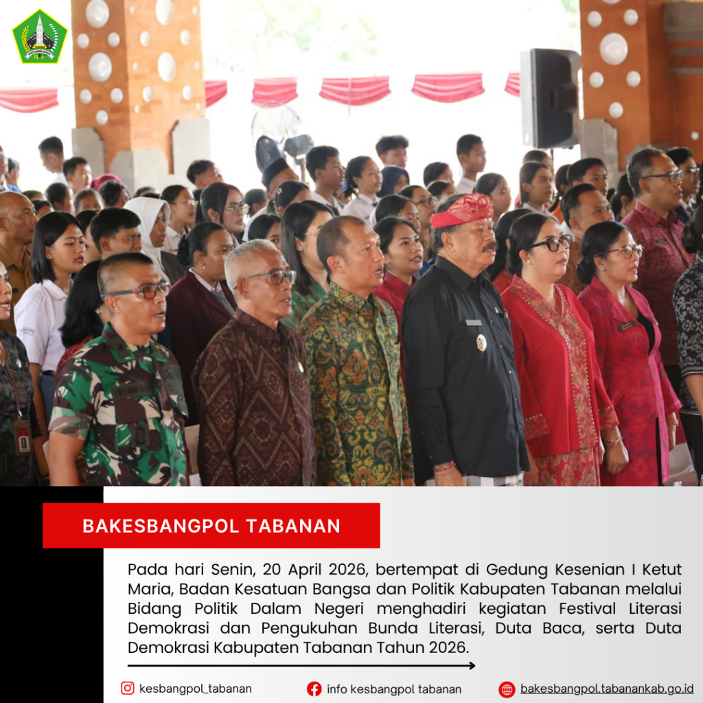 Pada hari Senin, 20 April 2026, bertempat di Gedung Kesenian I Ketut Maria, dilaksanakan kegiatan Festival Literasi Demokrasi dan Pengukuhan Bunda Literasi, Duta Baca, serta Duta Demokrasi Kabupaten Tabanan Tahun 2026. Kegiatan ini dihadiri oleh berbagai unsur pemerintah daerah, pelajar, serta masyarakat sebagai bagian dari upaya meningkatkan budaya literasi dan kesadaran demokrasi di Kabupaten Tabanan.