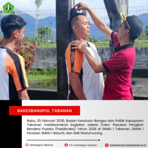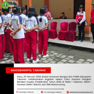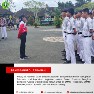 Tabanan, Rabu, 25 Februari 2026 – Badan Kesatuan Bangsa dan Politik Kabupaten Tabanan kembali melaksanakan kegiatan seleksi Calon Pasukan Pengibar Bendera Pusaka (Paskibraka) Tahun 2026 sebagai bagian dari tahapan rekrutmen dan penjaringan putra-putri terbaik daerah.