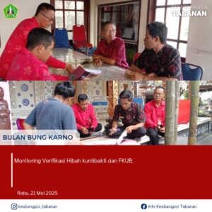 Berita Monitoring Verifikasi Hibah Admin 30 Juli 2025 Rabu, 21 Mei 2025. Bidang IV melaksanakan Monitoring Verifikasi Hibah Kuntibakti dan FKUB. Continue Reading Previous Rapat persiapan Pelaksanaan BBK VII Tahun 2025Next Wahyu, putra terbaik Tabanan, melangkah ke Seleksi Paskibraka Tingkat Nasional 2025! More Stories Berita Kesbangpol Tabanan Hadiri Persembahyangan Siwaratri di Pura Luhur Dalem Purwo Kubontingguh Admin 19 Januari 2026 Berita Kesbangpol Tabanan Hadiri Kegiatan Jumat Sehat dan Launching Fasilitas Olahraga di Lapangan Alit Saputra Admin 19 Januari 2026 Berita Kesbangpol Tabanan Laksanakan Pembinaan dan Pengawasan Organisasi Kemasyarakatan Admin 19 Januari 2026 Berita RENJA 2025 Admin 15 Januari 2026 Berita PEGAWAI PEMERINTAH DENGAN PERJANJIAN KERJA (PPPK) DENGAN PERJANJIAN KERJA PARUH WAKTU Admin 6 Januari 2026 Berita Rapat Internal Bakesbangpol Kabupaten Tabanan Admin 6 Januari 2026