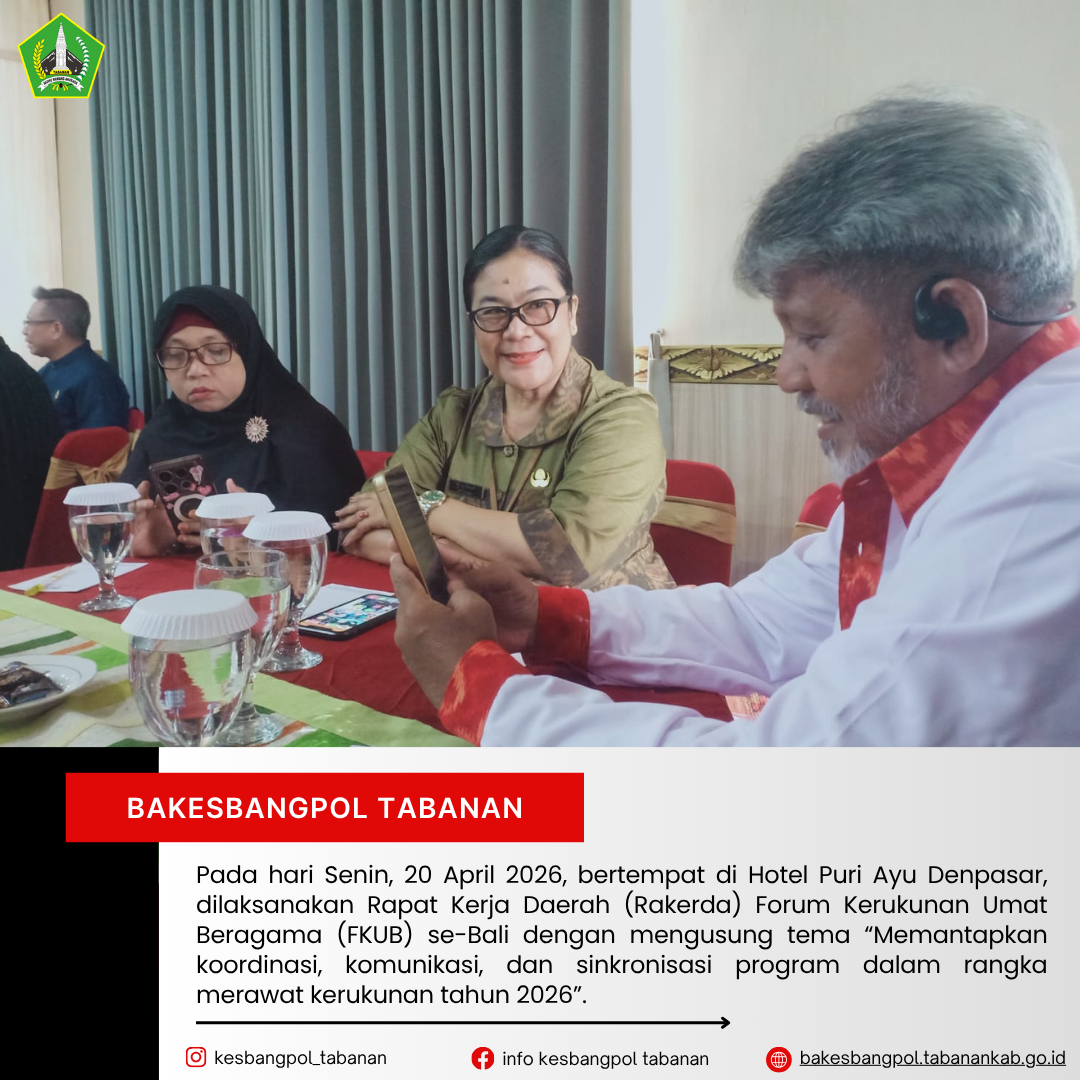 Pada hari Senin, 20 April 2026, bertempat di Hotel Puri Ayu Denpasar, dilaksanakan Rapat Kerja Daerah (Rakerda) Forum Kerukunan Umat Beragama (FKUB) se-Bali. Kegiatan ini mengusung tema “Memantapkan koordinasi, komunikasi, dan sinkronisasi program dalam rangka merawat kerukunan tahun 2026”.
