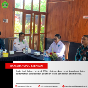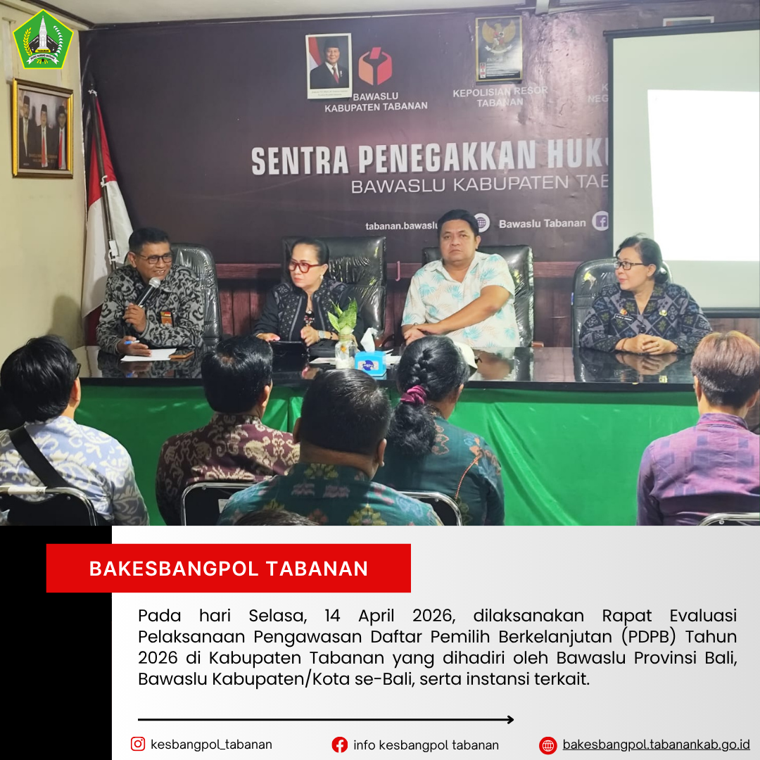 Pada hari Selasa, 14 April 2026, dilaksanakan Rapat Evaluasi Pelaksanaan Pengawasan Daftar Pemilih Berkelanjutan (PDPB) Tahun 2026 yang bertempat di Kabupaten Tabanan. Kegiatan ini dihadiri oleh Bawaslu Provinsi Bali, Bawaslu Kabupaten/Kota se-Bali, serta instansi terkait termasuk Badan Kesatuan Bangsa dan Politik Kabupaten Tabanan.